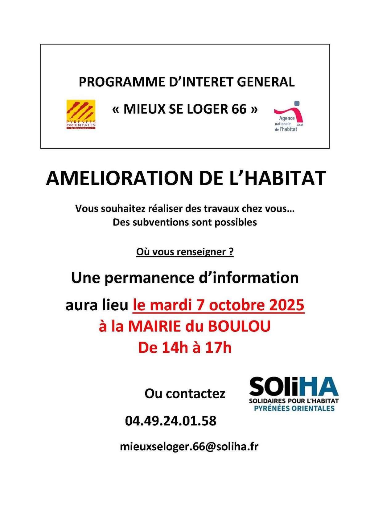 Une permanence d’information sur les aides à l’amélioration de l’habitat dans le cadre du nouveau programme « Mieux se loger 66 » lancé par le Conseil départemental en partenariat avec l’ANAH, aura lieu le mardi 7 octobre 2025 de 14H à 17H à la mairie du Boulou.