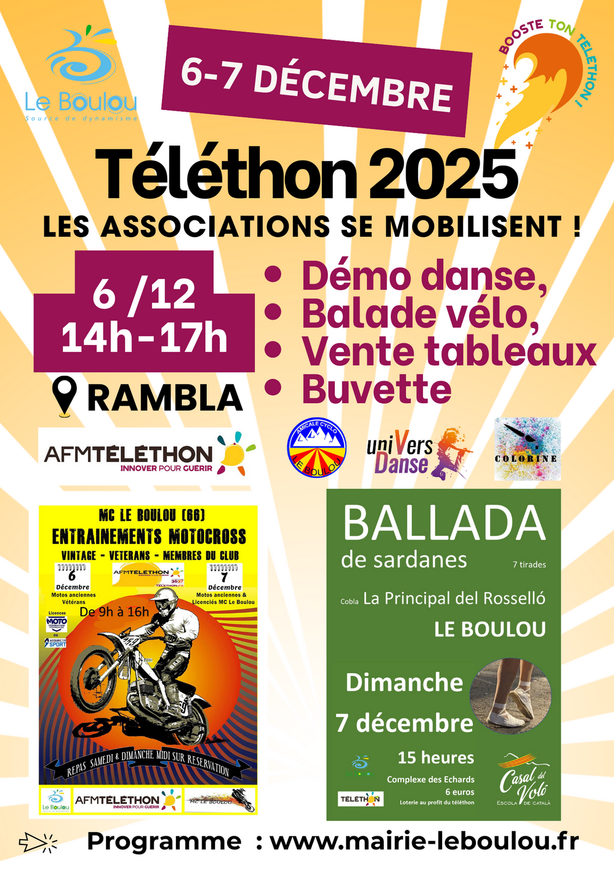 À l’occasion du Téléthon 2025, la Ville du Boulou et de nombreuses associations locales uniront leurs forces les 6 et 7 décembre pour proposer deux journées d’animations sportives, artistiques et culturelles au profit de la recherche médicale.
