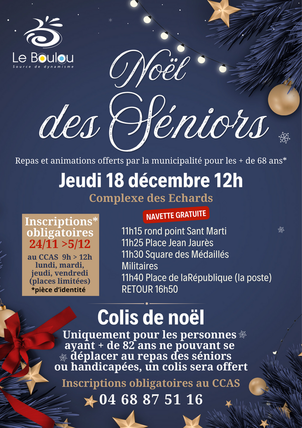 La Ville du Boulou organise son traditionnel repas de Noël des Séniors le jeudi 18 décembre à 12h, au Complexe des Echards.
