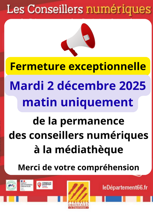 La permanence des conseillers numériques à la médiathèque municipale, sera exceptionnellement fermée Mardi 2 décembre 2025 matin uniquement.