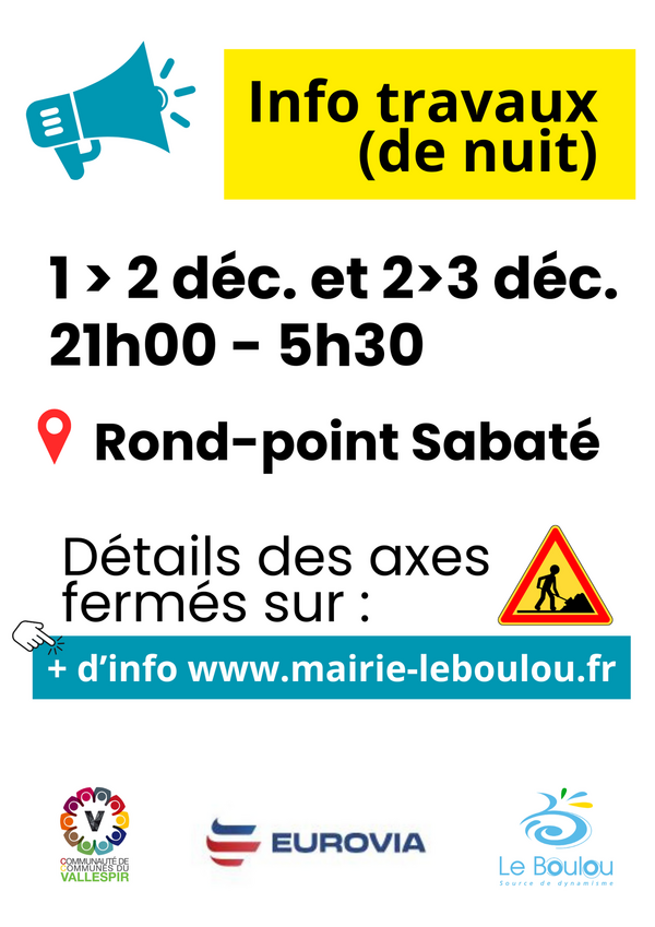 La Ville du Boulou informe les habitants que des travaux de réfection de voirie seront réalisés de nuit, entre 21h00 et 5h30.