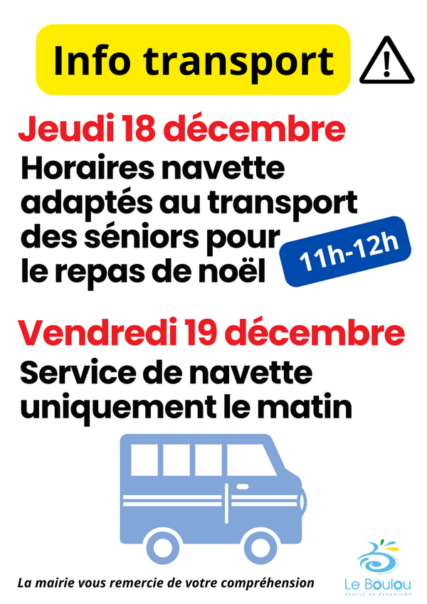 Dans le cadre du repas de Noël des Seniors organisé par la municipalité, les horaires de la navette seront modifiés et adaptés afin de faciliter leurs déplacements.