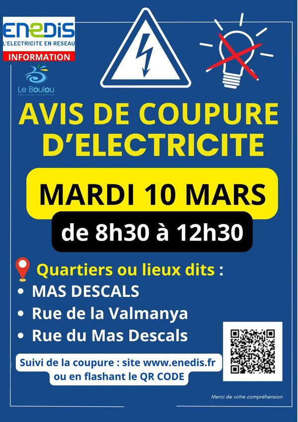 Afin d'améliorer la qualité de la distribution électrique et de répondre aux besoins de notre clientèle, Enedis réalise des travaux sur le réseau électrique qui alimente la commune qui entraineront une ou plusieurs coupures d'électricité.