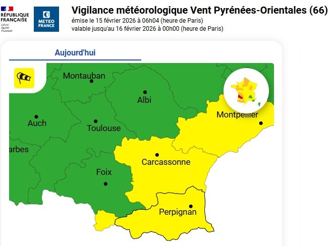 Le département des Pyrénées-Orientales est en vigilance jaune dimanche 15 février 2026.