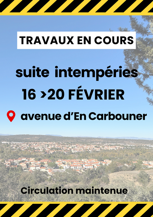 Suite aux dernières intempéries, des travaux de curage des fossés et bas-côtés seront réalisés avenue d’En Carbouner du lundi 16 au vendredi 20 février