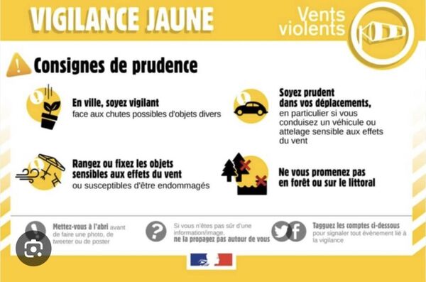 Merci d’être particulièrement vigilants dans l’organisation des activités de plein air et de prendre toutes les mesures de prévention habituelles en cas de coup de vent.