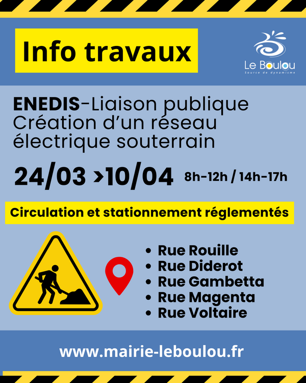 La Ville du Boulou informe les habitants de la réalisation de travaux de création d’un réseau électrique souterrain (ENEDIS) en centre-ville.